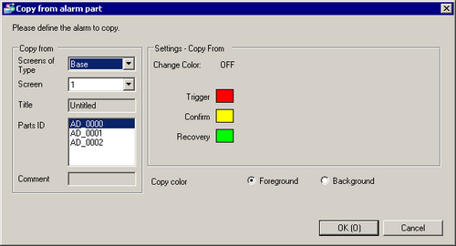 Lists all alarm parts in the specified screen. Select the part(s) you want to copy.