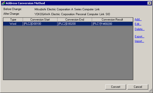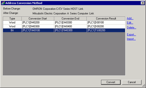 [Type]*2, [Device/PLC Name] Convert-From Start Address,[Device/PLC Name] Convert-From End Address, [Device/PLC Name] Convert-To Start Address