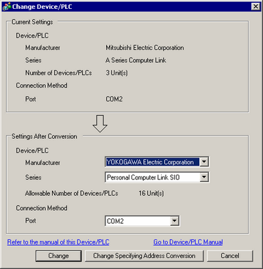 In the [Device/PLC] page click [Change Device/PLC] and the following dialog box appears. Select the model of the Device/PLC you want to change.