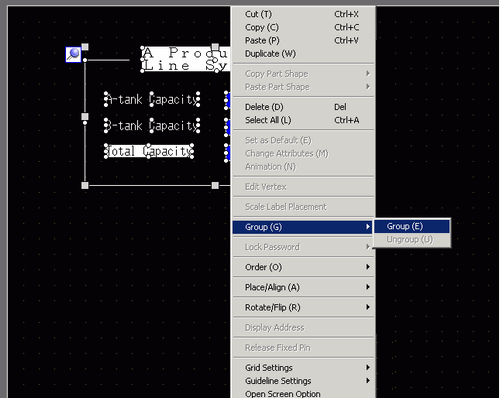 You can group multiple objects and handle them as one object. To do so, select multiple objects, right-click, and click [Group (E)]. To ungroup, click [Ungroup (U)].