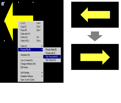 From the object's center, you can flip objects vertically (X-axis) or horizontally (Y-axis). Select the object to flip, and from the right-click menu point to [Rotate/Flip (R)] and click [Flip Horizontal (H)] or [Flip Vertical (V)]. The following example shows a polygon flipped horizontally. Please note that when you flip screens, marks, parts, and text that are called into the screen, only the display position changes.