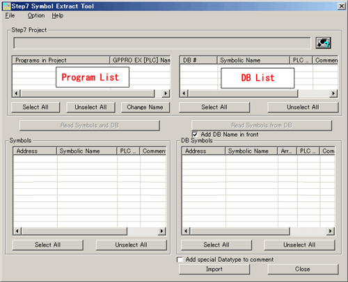 Reads symbol information from data blocks selected in the [DB #] table, and displays the result in the [DB Symbols] table.