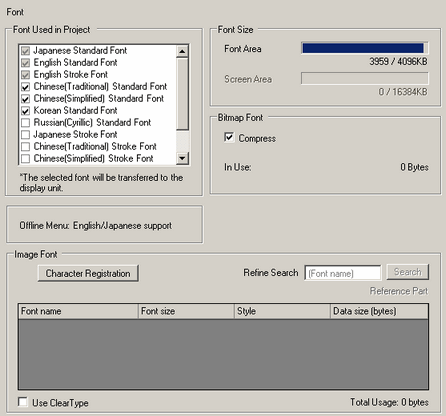 • When the size of a font or bitmap image to be registered is larger than the available font area, the font or image will be registered in the Screen Area. One font or bitmap image will not be registered separately in the Font Area and the Screen Area.