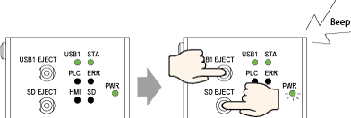 For 3 or more seconds, simultaneously hold down both the [USB storage eject switch] and [SD card eject switch] on the GP-4G01. After 3 seconds, the buzzer sounds and the power LED (PWR) flashes green.