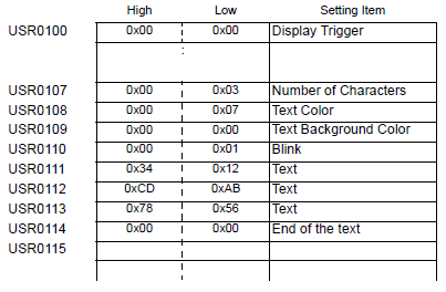 For example, when USR0100 is specified for the internal address and three characters with text data of 0x1234, 0xABCD and 0x5678 are stored (Display Trigger: 0, Text Color: 7, Text Background Color: 0, Blink: 1)