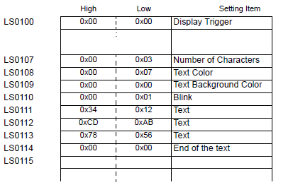 For example, when LS0100 is specified for the internal address and three characters with text data of 0x1234, 0xABCD and 0x5678 are stored (Display Trigger: 0, Text Color: 7, Text Background Color: 0, Blink: 1)