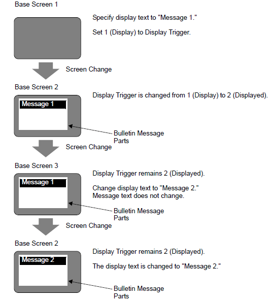 When the specified address of the Bulletin Message Parts to which the screen will be changed is in [Display] or [Displayed] state, the text will be displayed within the message display range after the screen is changed.