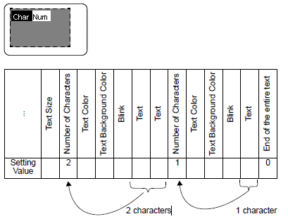 Number of Characters (Specified Address+7), Text Color (Specified Address+8), Text Background Color (Specified Address+9) and Blink (Specified Address+10) must be set collectively as one setting.