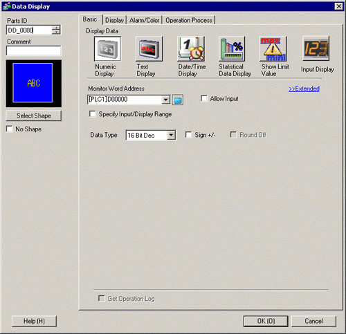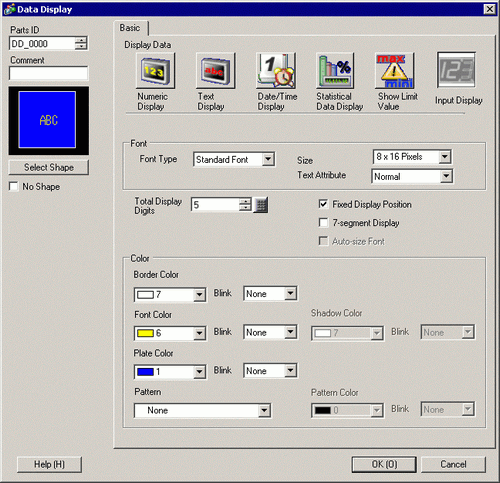 As required, set the Data Display color and text on the [Color/Alarm] and [Display] tabs, and click [OK].