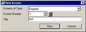 From the [Screens of Type], select [Keypad]. Set [Screen Number] and [Title] and click [New]. (For example, [Screen Number] 1, [Title] test)