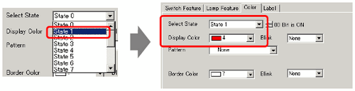 Select [State 1] in [Select State] and set the [Display Color]. [State 1] is the state in which "Bit 0" of Word Address D100 is ON.