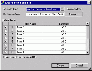 When you click the [Create] button, the Text Table file is created in the destination folder specified in [Destination Folder].