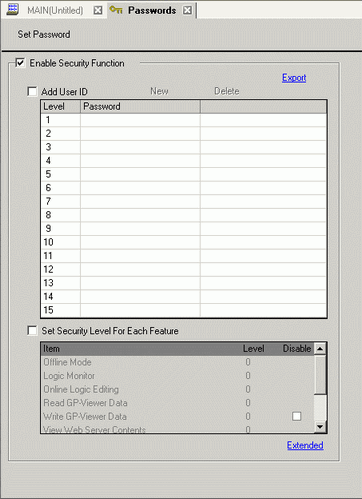 The password setting screen will open. Select the [Enable Security Function] check box, and type the password for each level of user.