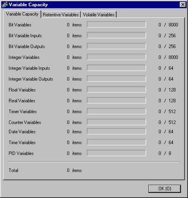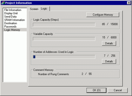 Click [Logic Memory] and then click the [Logic] tab to check [Logic Capacity (Steps)], [Variable Capacity], [Number of Addresses Used in Logic] and [Comment Memory].