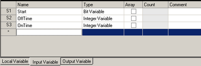 In the Function Block screen's variable list, select the [Input Variable] tab and register one bit variable and two integer variables. They will be used as input operands (S1 to S3) for the FB. (For example: enter "Start" for name and select "Bit Variable" for type.)