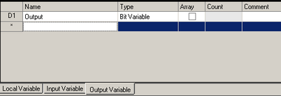 In the Function Block screen's variable list, select the [Output Variable] tab and register one bit variable. This will be used as output operand (D1) for the FB. (For example: enter "Output" in the name, and select "Bit Variable" in the type.)