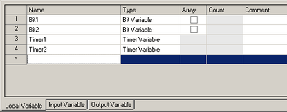 In the Function Block screen's variable list, select the [Local Variable] tab and register two bit variables and two timer variables. They are used within the FB only. (For example: enter "Bit1" in the name, and select "Bit Variable" in the type.)