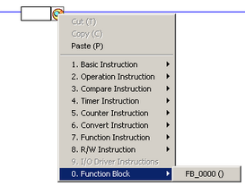 Open the Logic Screen, select [Function Block Instruction] from [Insert Instructions], and insert FB_0000.