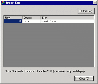 If you click [Output Log], the contents of the [Import Error] dialog box can be output as a file in CSV format.
