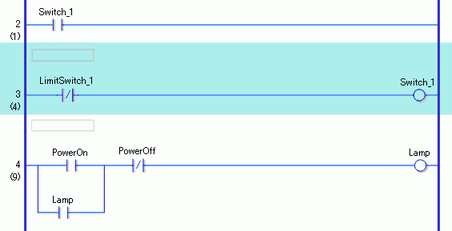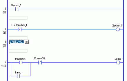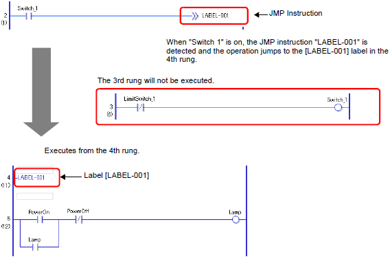 Here, for example, a [LABEL-001] label is inserted in the jump instruction, and the operation jumps to the 3rd rung upon execution of the JMP instruction when the "Switch 1" in the 2nd rung turns on.