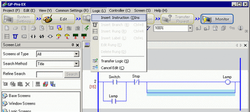 Select the point where you want to insert an instruction and click [Insert Instruction (I)] on the [Logic (L)] menu.