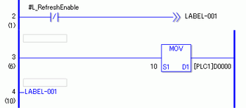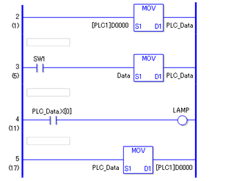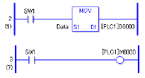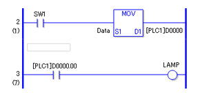 Example: The NO instruction [PLC1]D0000.00 will not show the data set in the MOV instruction [PLC1]D0000. Even if "1" is written in the variable "Data", the change is shown on [PLC1]D0000.00 only after a few scans.