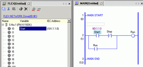 The following example shows the Logic (MAIN) and I/O (FLEX NETWORK) windows displayed side by side.