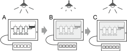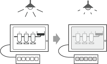 C. If the surrounding lighting changes while dimmed, the brightness of the EZ Illuminated Switch adjusts but the display screen brightness remains at the specified dimmer level. Touch the screen to release the dimmer state, and the brightness adjument resumes in relation to the brightness sensor.