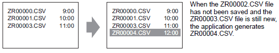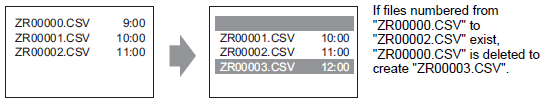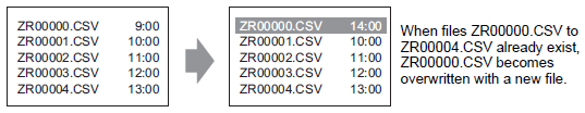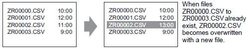 If the file numbers do not conform to time stamps in automatic numbering mode (when files are overwritten by manual transfer), a new file is created by increasing the most recent File Number by +1.