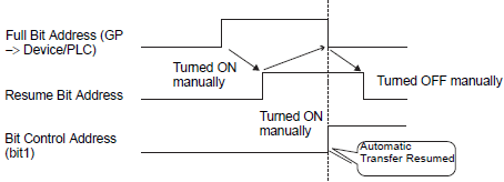Transfer may not work when files already exist up to the end number in external storage. When the display unit is turned ON, right after turning ON bit 1 in [Control Word Address], [Full Bit Address] turns ON. However, if the [Resume Bit Address] is ON, when you turn ON bit 1 in the [Control Word Address], files are overwritten beginning at the start number.