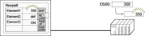From the display unit, if you change RecipeB's element value and save this change, the value in the mapped address (D500) also changes.