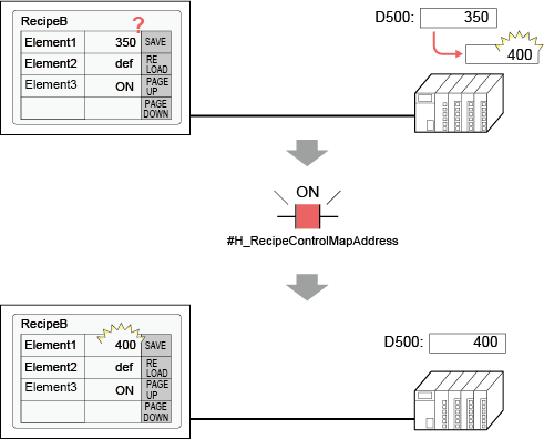 If you edit the value in the mapped address (D500), the associated element value in the enhanced recipe does not change. Use the system variable #H_RecipeControlMapAddress to save the element value in the current enhanced recipe. Always save the element value with system variables before transferring enhanced recipes.