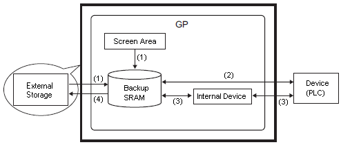 Depending on the screen transfer method, filing data created in GP-Pro EX is stored in the display unit's internal memory (Screen Area*1), or on external storage (external storage*2).
