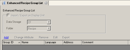 Selecting the check box enables you to output enhanced recipe data in CSV format from the display unit to external storage by using the system variable #H_RecipeControlCSVExport. You can use #H_RecipeControlCSVImport to import enhanced recipe data (CSV file) from external storage to the display unit.