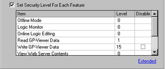 Next, select the [Set up Functions at Each Security Level] check box and define the security level set in the above procedure 2 for each [Item]. For example, [Read GP-Viewer Data] = Level "1", [Write GP-Viewer Data] = Level "15"