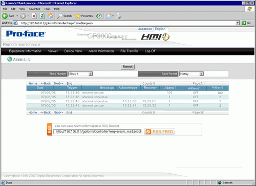 Displays alarm information as RSS data. The RSS URL displays whenever changing the [Block Number] or [Save Format]. RSS data is displayed by inputting this URL into the address part of the RSS reader.