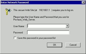 Enter the user name with up to 8 single-byte characters, as set up in the GP-Pro EX security settings. [User Name] is blank if user names have not been set up.