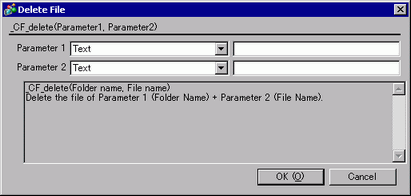 Deletes the specified file from the CF Card. Parameter 1 indicates the CF Card data folder. Parameter 2 indicates the name of the file to be deleted.