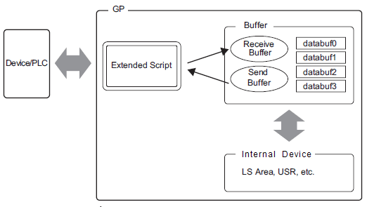 For Extended Script data management, as shown in the following picture, data is stored in databuf0 to databuf3 via the Send/Receive Buffer. As databuf is not divided by address, store the data to the display unit's internal device before editing the data on the device/PLC.