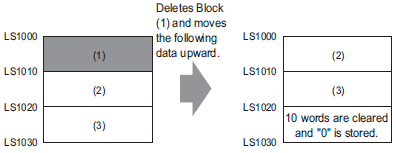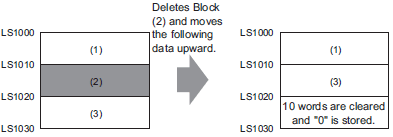 Deletes the specified block and moves the following data blocks upward. The block to be deleted is designated using an offset. When an error occurs, the error status is written to LS9151.