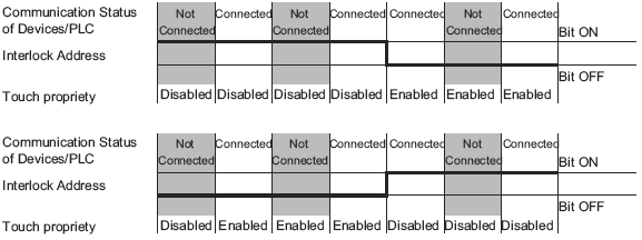 When the address of the external Device/PLC is designated as the global interlock address, Touch Enable Condition cannot be determined until the connection with that Device/PLC is established. Therefore, regardless of [Enable when Bit is ON]/[Enable when Bit is OFF], the global interlock will be enabled.