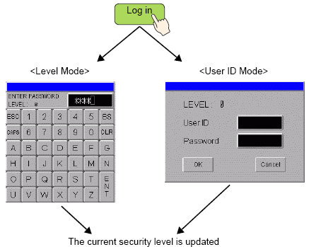 For User ID Mode, any ID is accepted if the ID exists for the security setting. When a proper password is entered, the "current security level" is changed to the level for which the ID is set, and the system variable "H_LoginUserID" is updated.