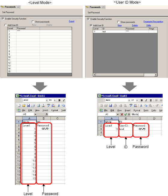 Password setting data in CSV format can be created by exporting the password setting of GP-Pro EX in CSV format.