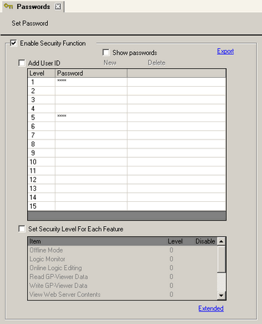 Password setting screen will open. Select the [Enable Security Function] check box and enter [Level 1] and [Level 5] passwords.