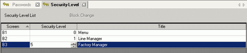 Set up a Factory Manager screen (B3) with security level 5 and a password.