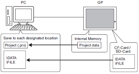 If the [CF Card Folder] ([SD Card Folder]) is set up in the project, data in the CF/SD card (\DATA and \FILE) is saved to the defined location.