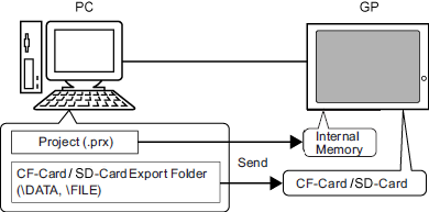 If [CF Card Folder]/[SD Card Folder] is set up in the project, data (\DATA and \FILE) in the CF/SD card destination folder is saved to the CF/SD card in the display unit when transferring.