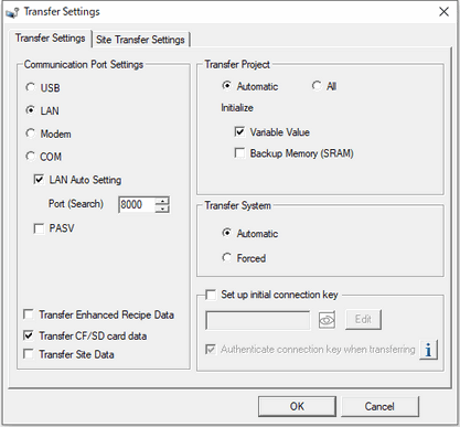 You can also open the same dialog box from GP-Pro EX's [Project (F)] menu by selecting [Transfer Project (G)] and then [Transfer Settings (C)].