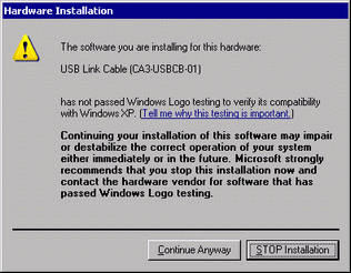 Depending on your Windows XP Security Level settings, the following [Install Hardware] dialog box may appear during USB driver installation. Click [Continue (C)] to start installation of the driver. After installation is completed, click [Complete].