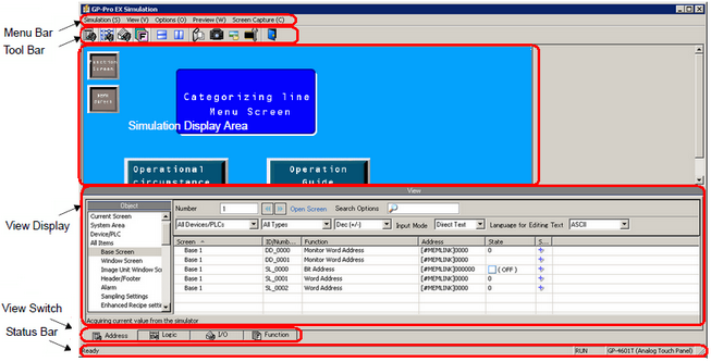 [Address View], [Logic View], [I/O View] and [Function View] can be separated from [GP-Pro EX Simulation] using drag and drop.